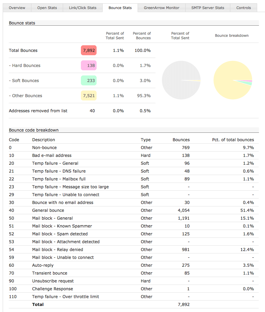 Of course, not all deferrals, bounces, and refusals are the result of rate limiting. There are a lot of potential reasons for an ISP to defer or bounce a delivery attempt, so how can you determine what your ISPs are telling you? The SMTP reply and/or enhanced status codes they send can provide valuable insight into what the issues are. GreenArrow’s Statistics also does an excellent job of classifying each bounce and deferral and telling you what it means. (See box.)