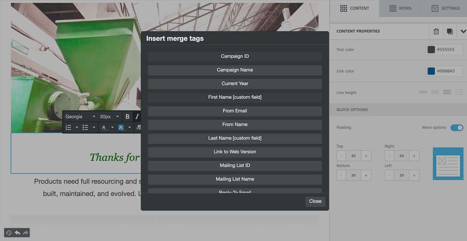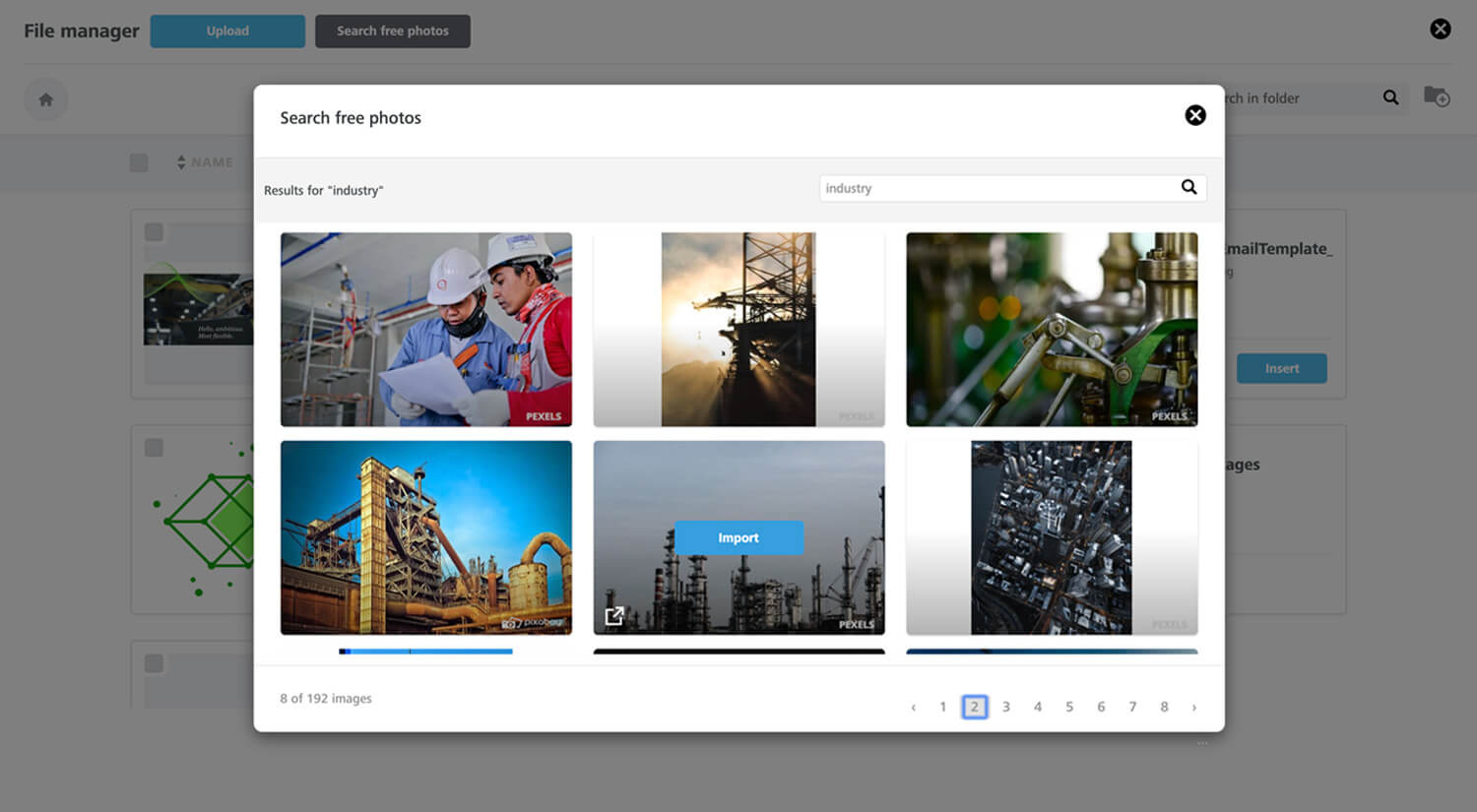 Nothing livens up an email better than striking photography. Don’t have a design team or photographer on staff? No problem! Our editor comes equipped with a built-in stock photography search tool that offers over 500,000 professional photos you can use for FREE under their Creative Commons license.