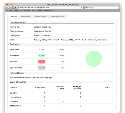 GreenArrow Engine provides an API for retrieving statistics in embeddable HTML format, or a JSON or PHP serialized array. Stats can be retrieved for campaigns or recipients. This allows you to directly embed GreenArrow Engine’s reports into your own application.