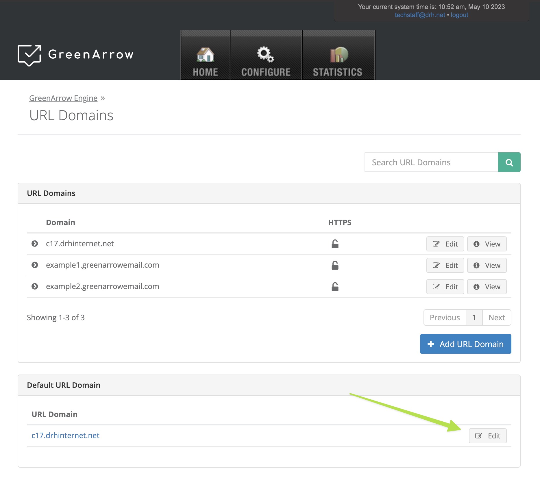 GreenArrow Engine and Studio are able to use multiple domain names for click and open tracking. The domain that’s used for click and open tracking can be set by selecting a value from the “URL Domain” drop-down menu in GreenArrow Studio’s web interface, or through GreenArrow Studio’s API.