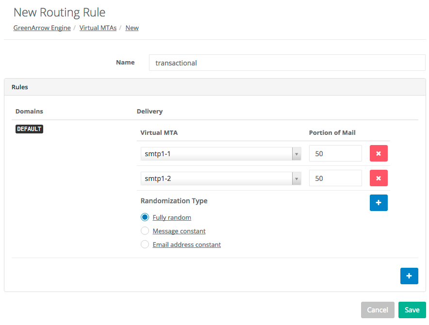 Rules- select one or more existing VirtualMTAs to send mail through, and what percentage of mail each should send. -