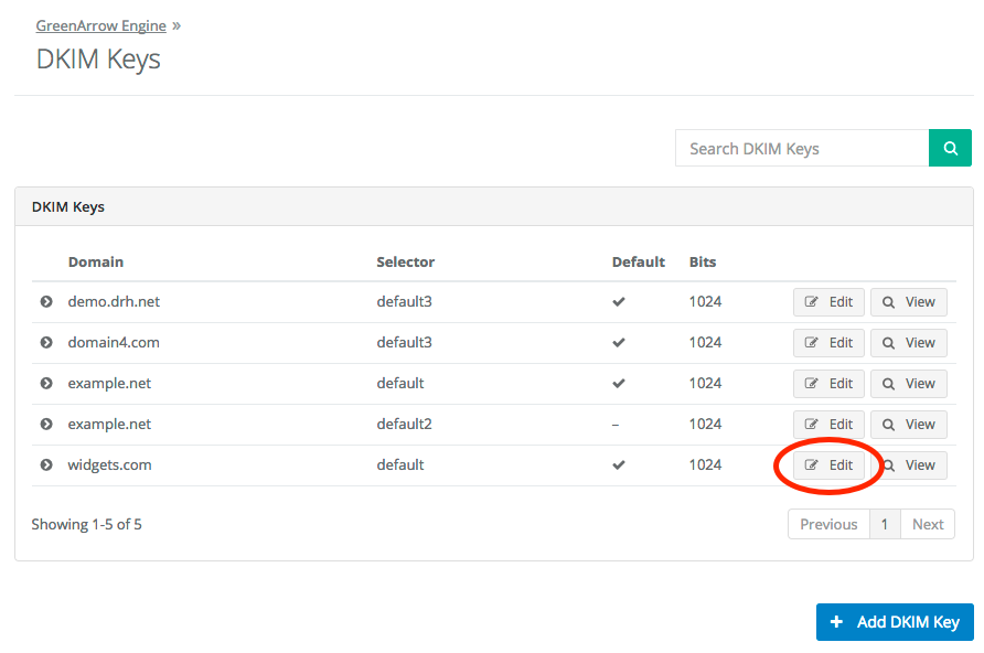 - Locate the DKIM key that you wish to use by default for a domain, and click the