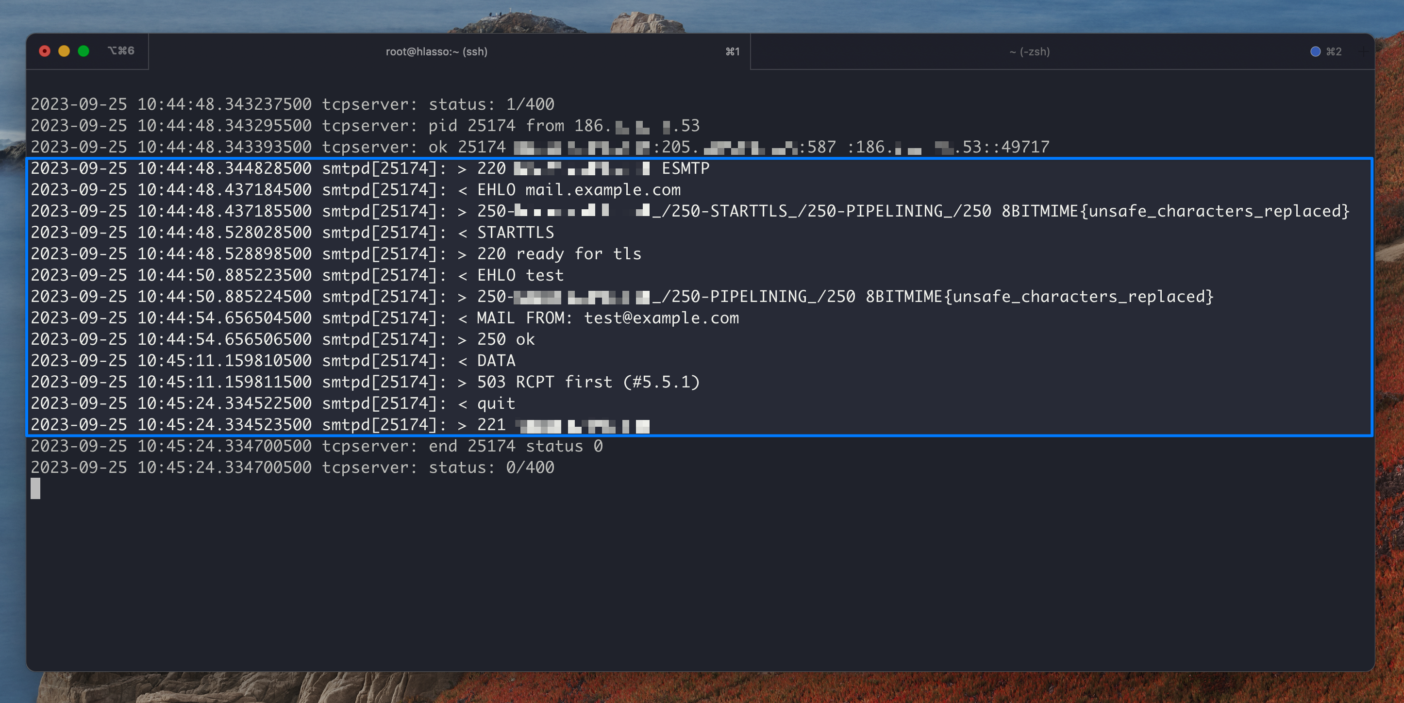 These SMTP sessions will be logged on the corresponding SMTP service log file.. You can monitor the SMTP2 log with the following command: