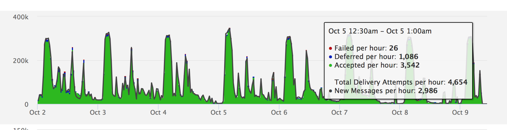 The Y-axis of this chart is messages/delivery-attempts per hour. The Accepted, Failed, and Deferred stats are represented as a stacked bar chart, so that the top of the bar-chart colored area represents the rate of delivery attempts per hour.