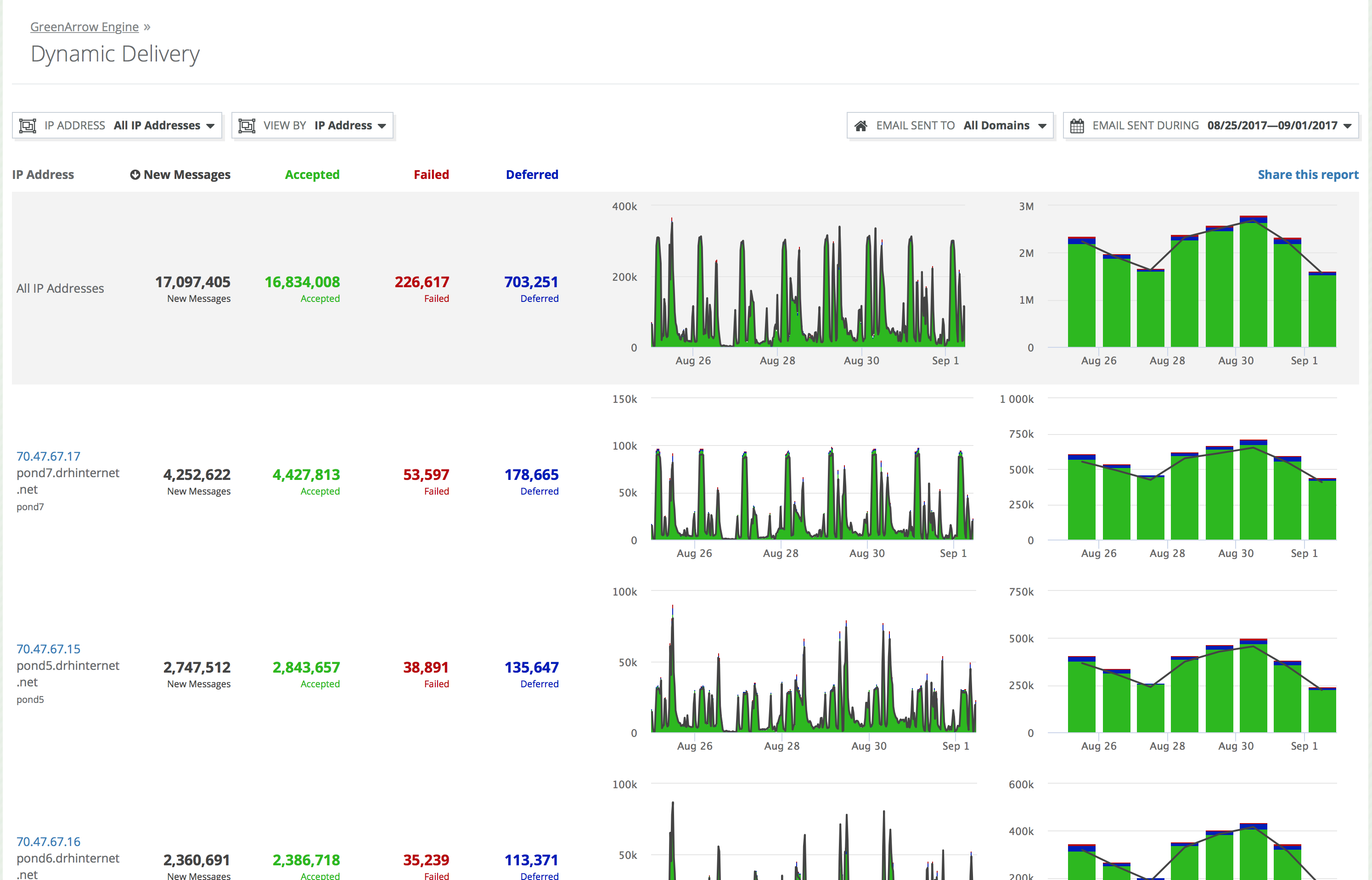 This shows a single row for each IP address, providing a summary of the delivery performance of each IP. This option is only available when “All IP Addresses” is selected.