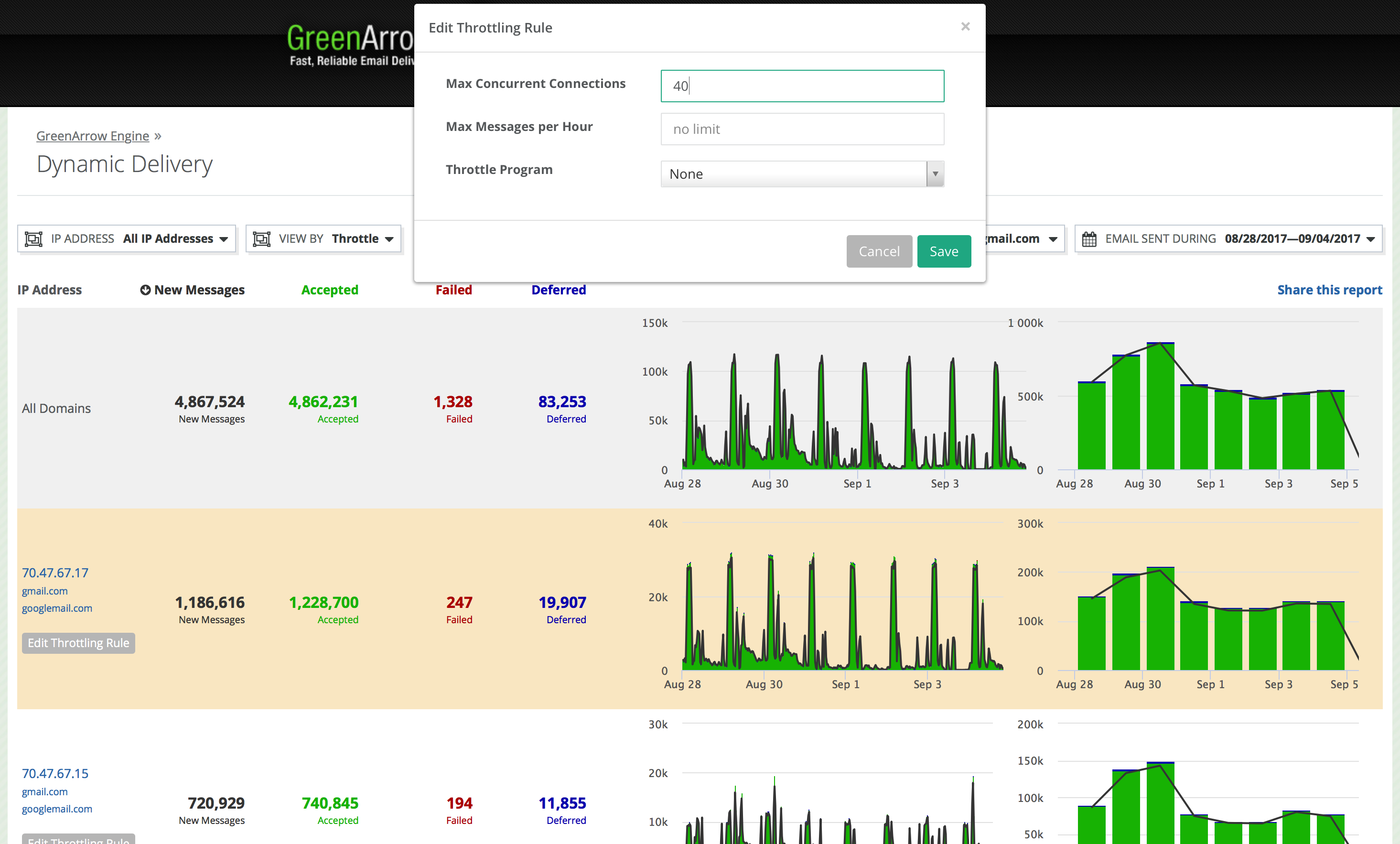 The Dynamic Delivery statistics page provides insight into recent delivery activity in GreenArrow Engine. You may use it to view the performance of IP addresses, relay servers, throttling rules, or results for specific domain names.