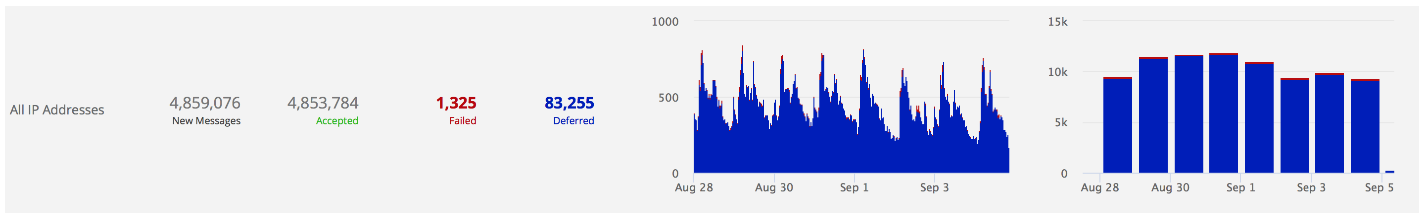 Date ranges of greater than one day will also include a daily summary graph. In the summary graph the Y-axis is the total number of messages/delivery-attempts per day.