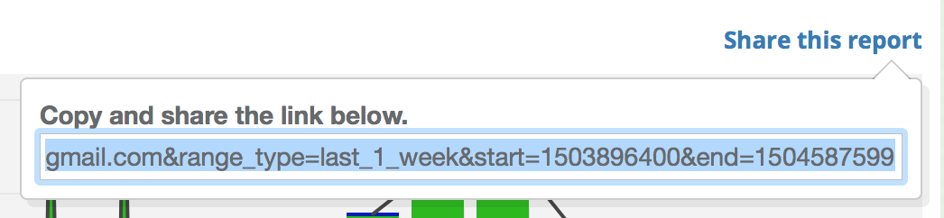 Click on “Share this report” to receive a URL that can be shared. The shared link will contain the precise date range used in the current report. Viewing the shared URL will require authorization to access GreenArrow Engine.