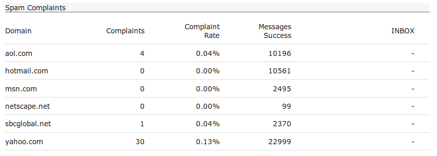 Spam complaints from feedback loops are listed at the bottom of this page. Spam complaints are listed by domain. The list of domains automatically expands to include all domains for which at least one complaint occurred.
