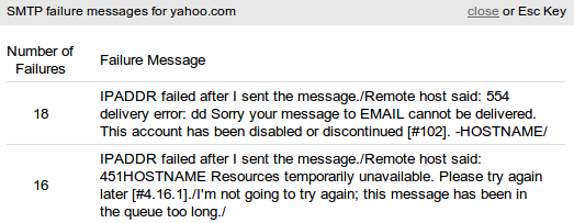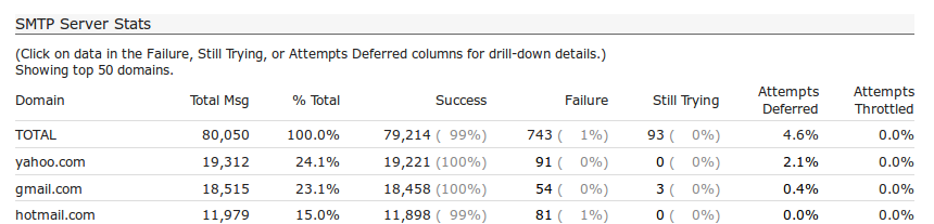 Attempts Deferred- The percentage of delivery attempts that had a deferral take place. This figure is useful because if there is a deferral problem on a send, this column will always show it. TheStill tryingcolumn will only indicate a deferral problem as long as there are still messages in the queue. You can click on a domain’sAttempts Deferredpercentage to view the20most frequent deferral messages, sorted by frequency. -
