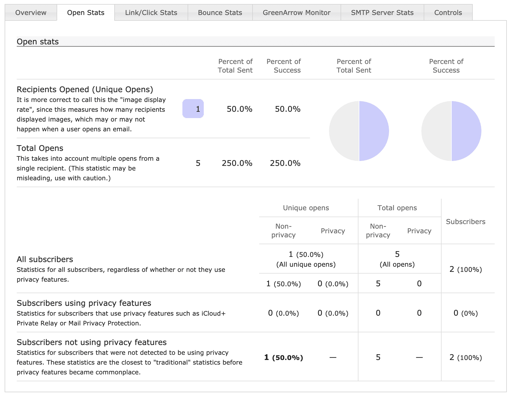 The Open Stats tab is only displayed if open tracking was turned on for a send. When present, this tab shows stats on subscribers who opened the send. An open occurs when a subscriber load images.