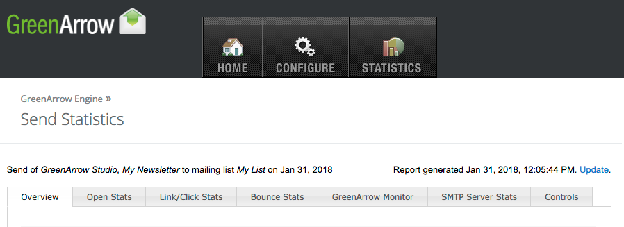 Each send that’s performed using GreenArrow Engine has a Send Statistics page. These pages are linked to and can be searched for from the Send Statistics Overview Page.