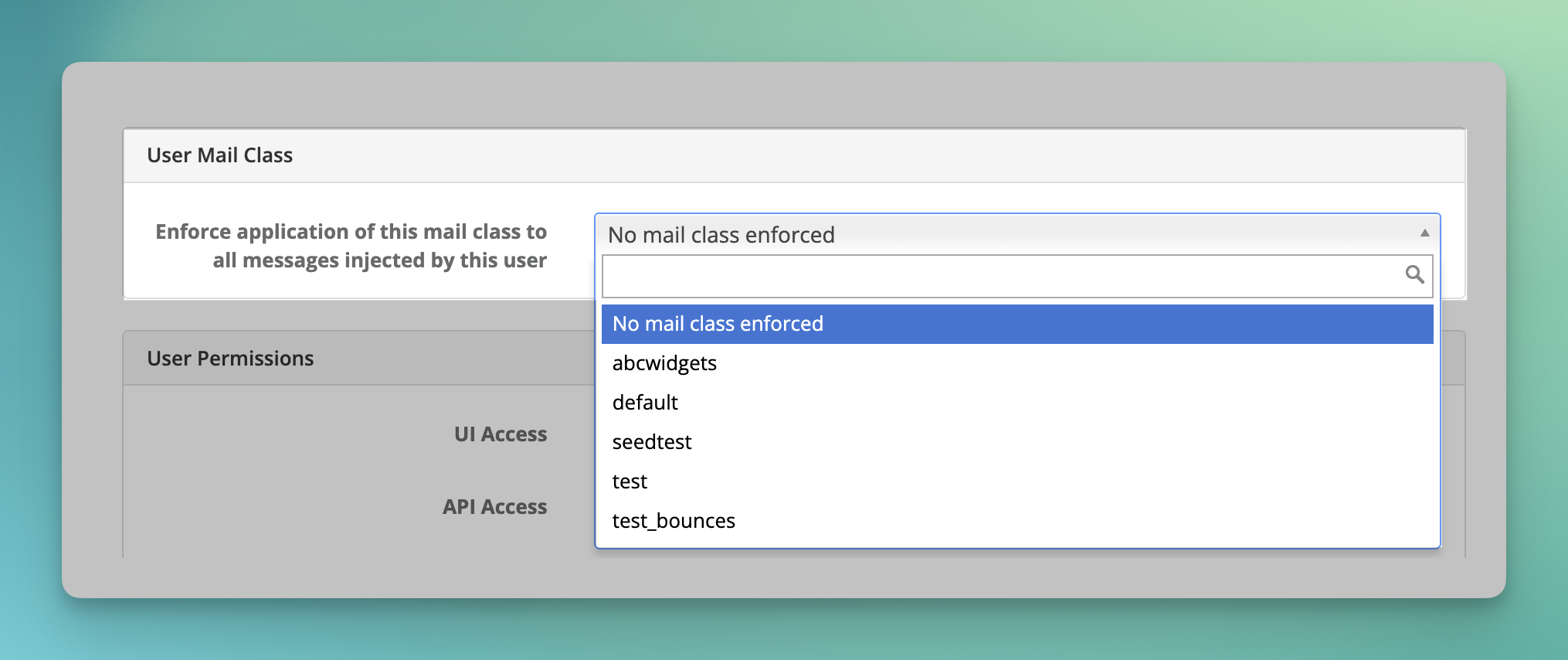 A mail class can be force on an user by selecting it from the drop down box under the section labeled “User Mail Class”.