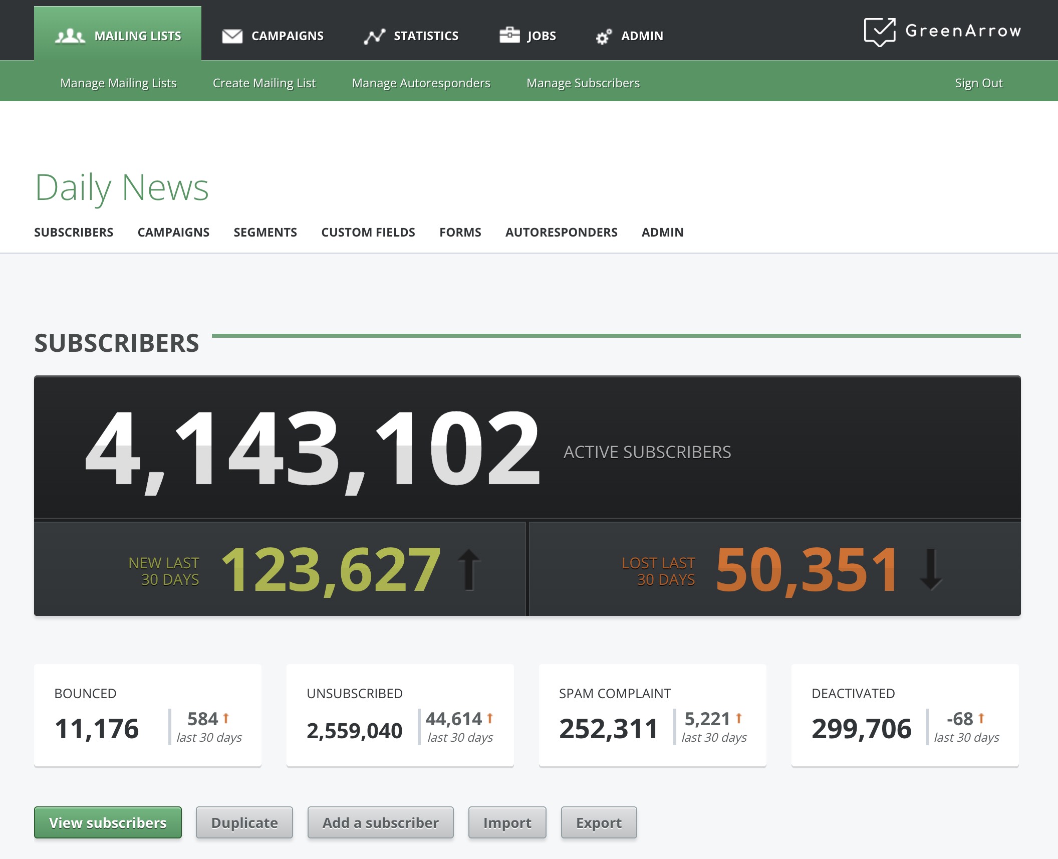 The Mailing List page shows an overview scoreboard of recent statistics for the mailing list.