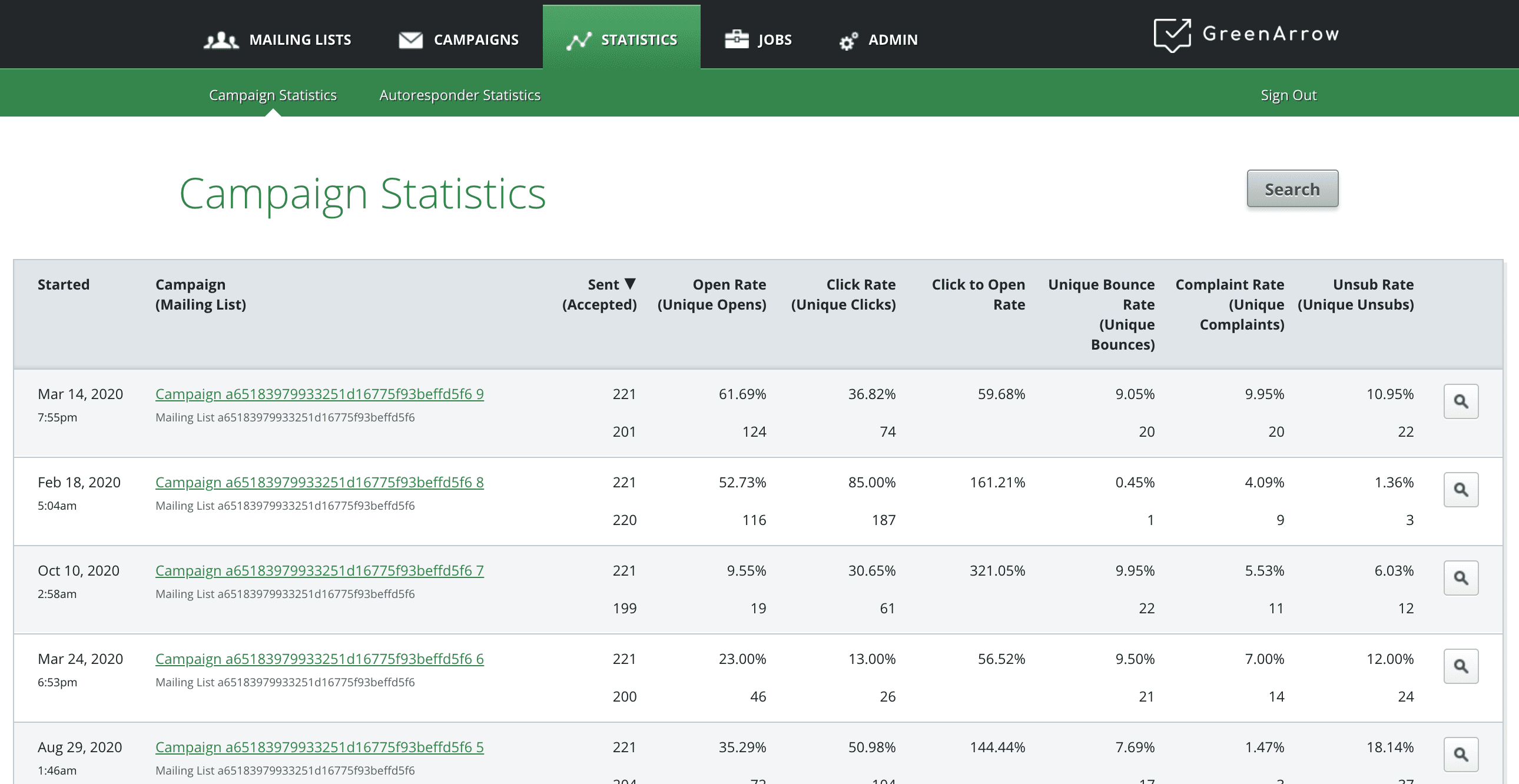 The Campaign Statistics Index screen presents a list of campaigns that were sent from GreenArrow Studio. By default, this list presents all campaigns with the newest at the top.