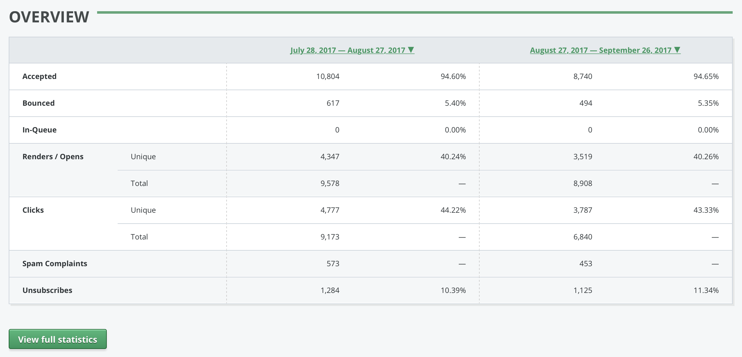 A summary of a mailing list’s performance can be viewed by clicking on the “Statistics” button, found on the mailing list’s page in the “Campaigns” section. The time range shown in this report can be adjusted using the “EMAIL SENT DURING” filter at the top of the page.