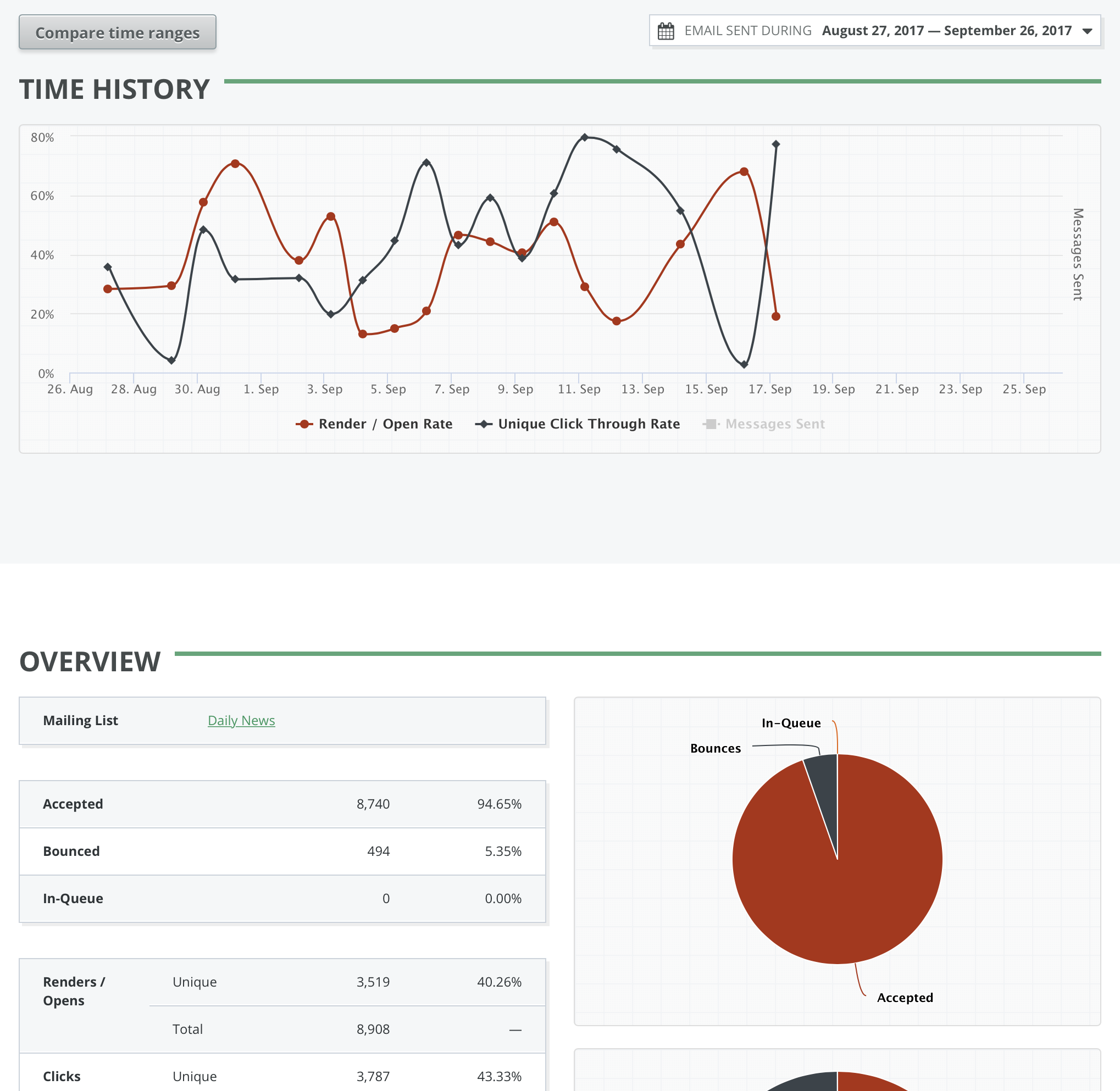 This report gives an overview of all campaigns sent to this mailing list. At the top of the report is a time history, showing open and click performance. On that chart, you may click on “Messages Sent” to also show the volume of email sent to this list.