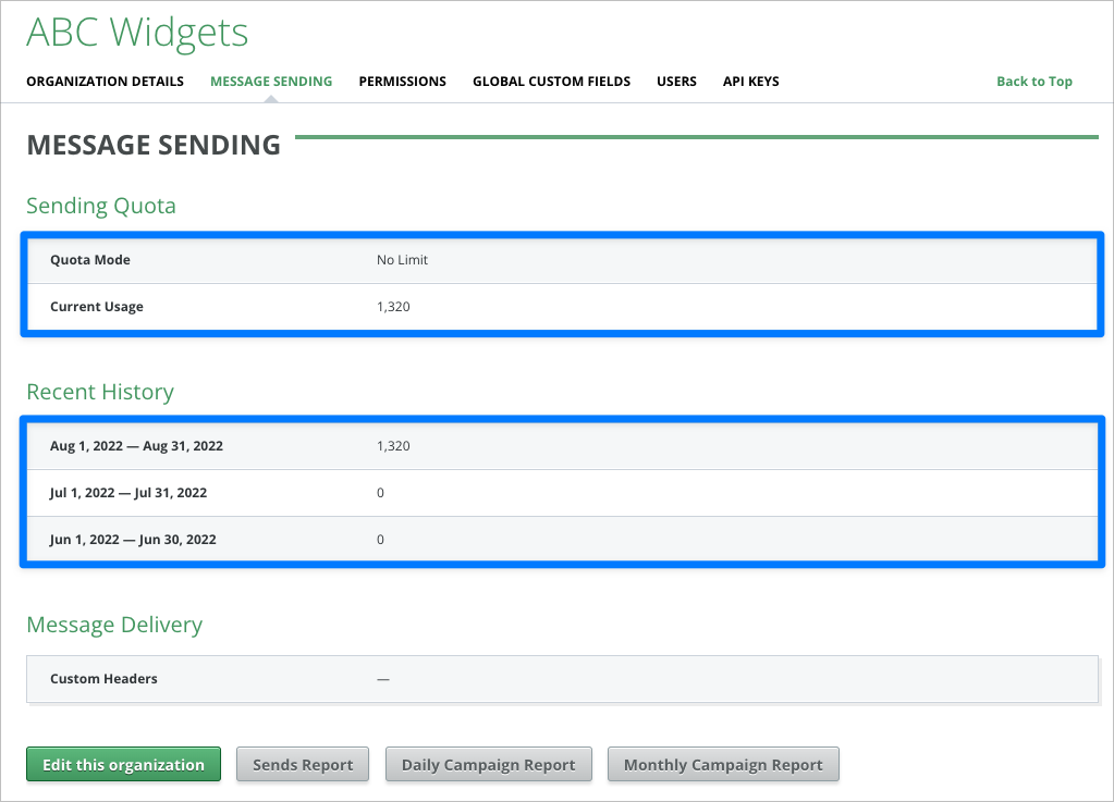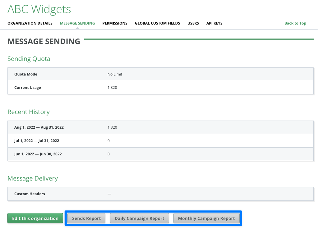 Clicking the Sends Report button will give you a CSV file containing the daily number of messages sent by that organization over the last year. The Daily Campaign Report will give you a CSV file containing list of campaigns sent over the last year with the number of messages per day. And the Monthly Campaign Report button will give you the list of campaigns sent over the last year, with the number of messages sent by each campaign per month.