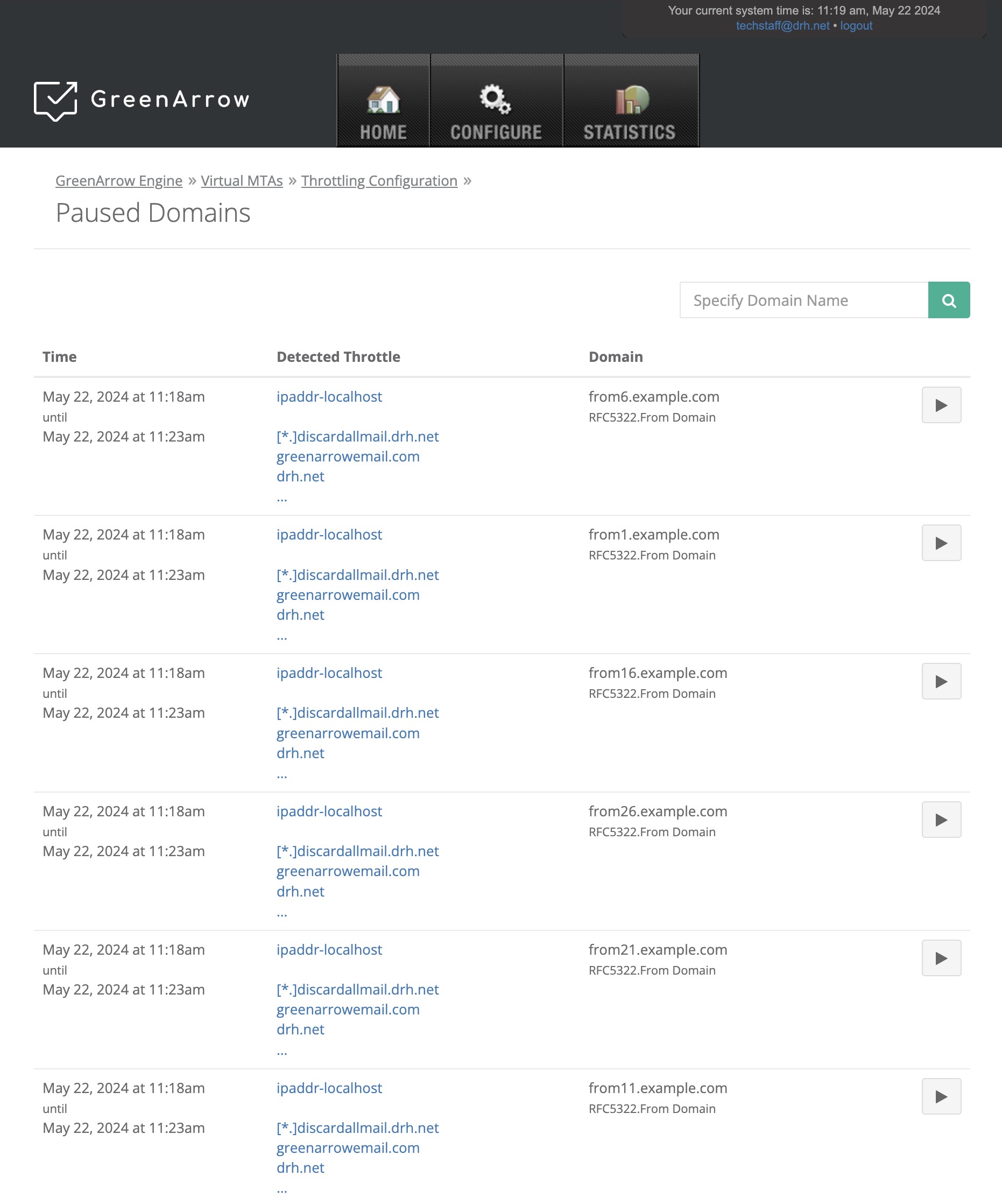 Paused domains may be reviewed in the “Paused Domains” screen (found under the “Throttling Configuration” section).